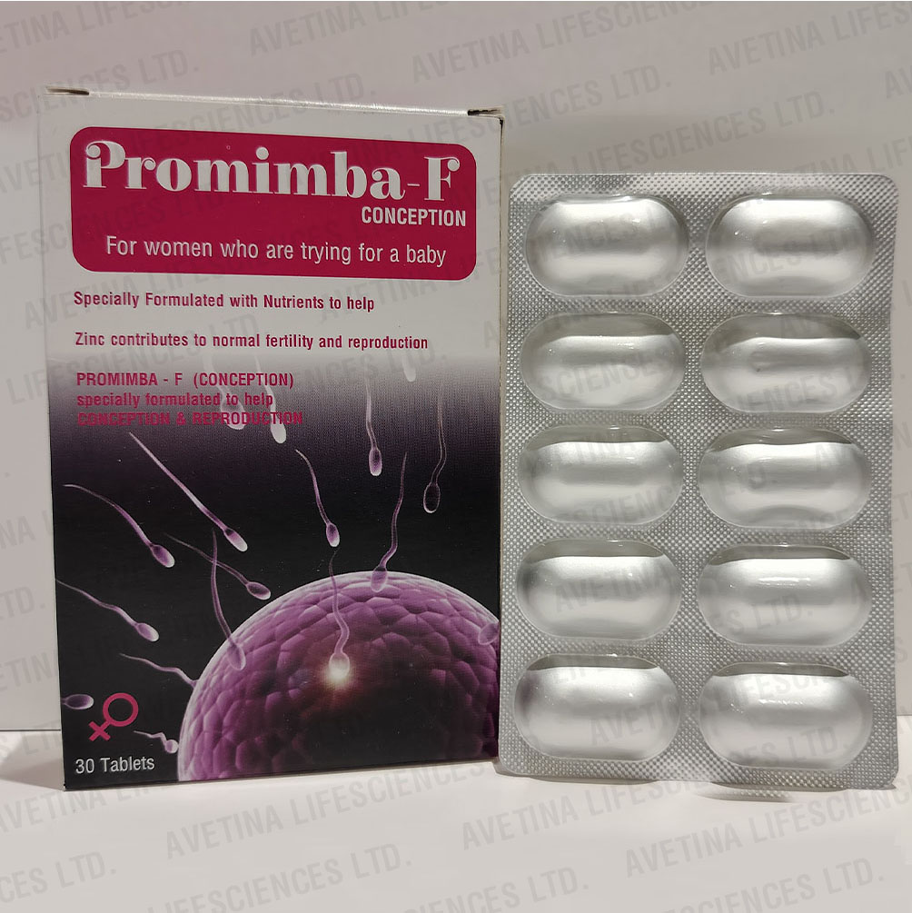 PROMIMBA - F Conception For Women with desire to have children. PROMIMBA - F Conception Increases chances of Quality Ova production, Improves quality and motility, Improves Morphology, Reduces Oxidative stress, L - Carnitine helps in development and maturation of Ova, protects Ova by reducing the influence of many free radicals. Antioxidant Z inc helps to improve overall health of Ova, Protects from Oxidative damage.