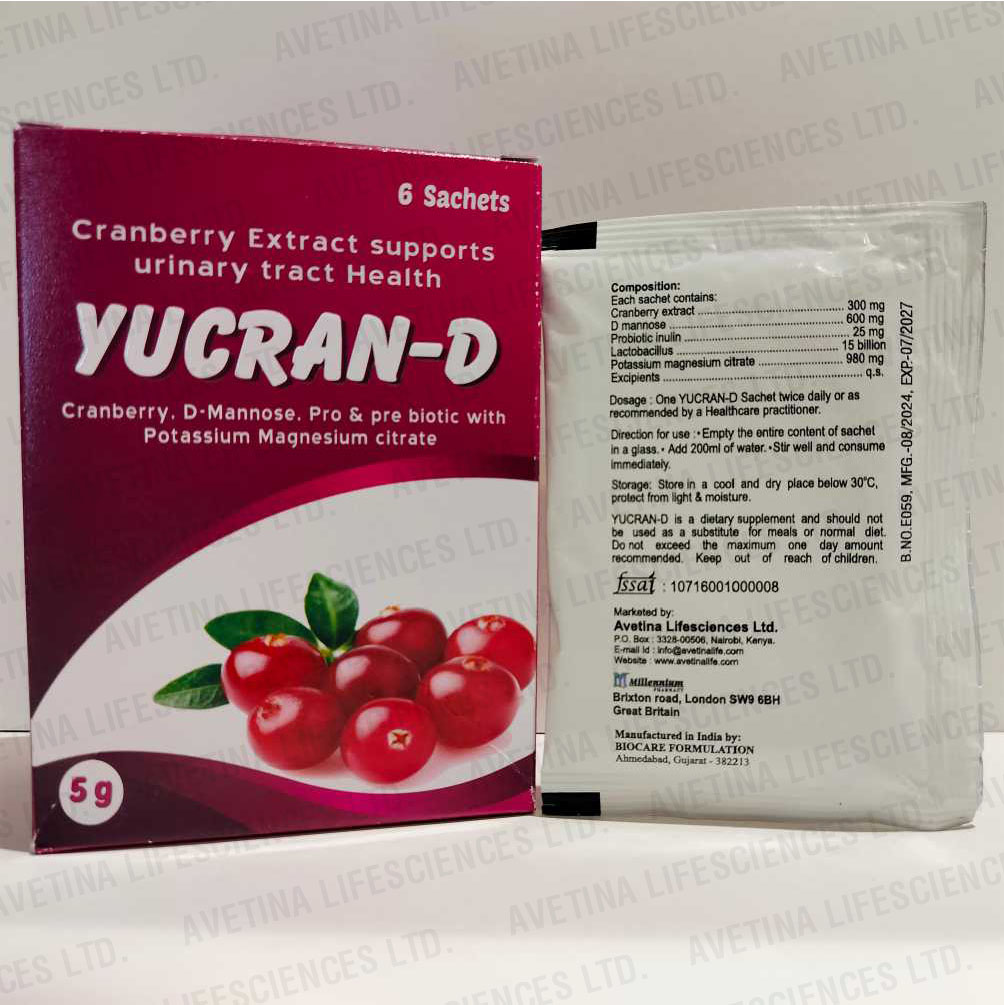Yucran-D is a nutritional supplement contains Potassium Magnesium Citrate , D-Mannose, and Cranberry Extract with probiotic inulin ,lactobacillus as active ingredients.The formulation is developed to prevents Urinary Tract Infection (UTIs).It prevents attachment of Uro-Pathogenic E.Coli to the kidney walls, thereby preventing pyelonephritis